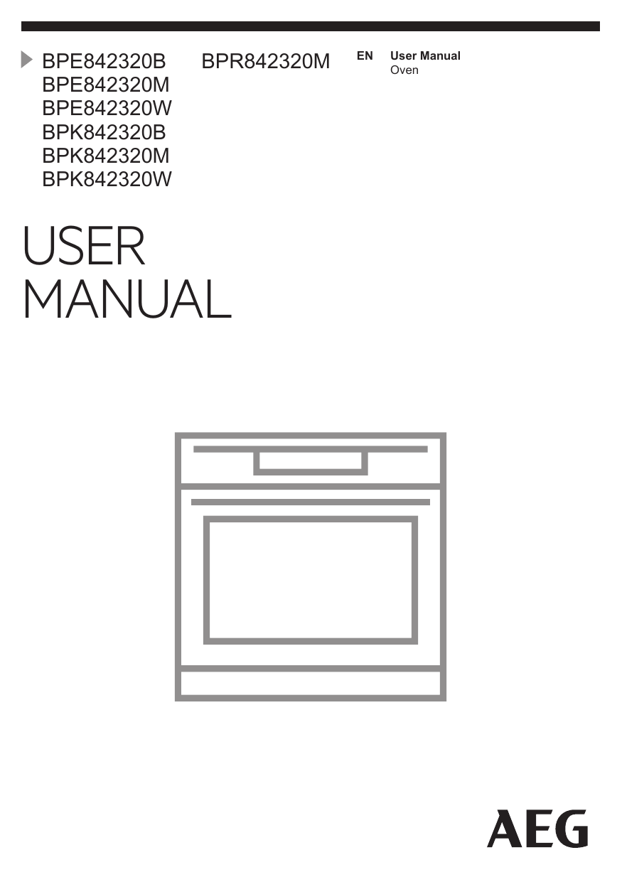 BPE842320B BPE842320M BPE842320W BPK842320B BPK842320M BPK842320W BPR842320M USER MANUAL EN User Manual Oven 2 www.aeg.com CONTENTS 1. SAFETY INFORMATION............................................................................................. 2 2. SAFETY INSTRUCTIONS.............................................................................................4 3. PRODUCT DESCRIPTION...........................................................................................7 4. OPERATING THE APPLIANCE................................................................................... 8 5. BEFORE FIRST USE..................................................................................................... 9 6. DAILY USE.................................................................................................................... 9 7. CLOCK FUNCTIONS.................................................................................................16 8. USING THE ACCESSORIES...................................................................................... 16 9. ADDITIONAL FUNCTIONS...................................................................................... 19 10. HINTS AND TIPS..................................................................................................... 19 11. CARE AND CLEANING.......................................................................................... 34 12. TROUBLESHOOTING............................................................................................. 37 13. TECHNICAL DATA..................................................................................................38 14. ENERGY EFFICIENCY............................................................................................. 39 FOR PERFECT RESULTS Thank you for choosing this AEG product. We have created it to give you impeccable performance for many years, with innovative technologies that help make life simpler features you might not find on ordinary appliances. Please spend a few minutes reading to get the very best from it. Visit our website for: Get usage advice, brochures, trouble shooter, service information: www.aeg.com/webselfservice Register your product for better service: www.registeraeg.com Buy Accessories, Consumables and Original spare parts for your appliance: www.aeg.com/shop CUSTOMER CARE AND SERVICE Always use original spare parts. When contacting our Authorised Service Centre, ensure that you have the following data available: Model, PNC, Serial Number. The information can be found on the rating plate. Warning / Caution-Safety information General information and tips Environmental information Subject to change without notice. 1. SAFETY INFORMATION Before the installation and use of the appliance, carefully read the supplied instructions. The ENGLISH 3 manufacturer is not responsible for any injuries or damages that are the result of incorrect installation or usage. Always keep the instructions in a safe and accessible location for future reference. 1.1 Children and vulnerable people safety • • • • • • • • This appliance can be used by children aged from 8 years and above and persons with reduced physical, sensory or mental capabilities or lack of experience and knowledge if they have been given supervision or instruction concerning the use of the appliance in a safe way and understand the hazards involved. Children between 3 and 8 years of age and persons with very extensive and complex disabilities shall be kept away unless continuously supervised. Children of less than 3 years of age should be kept away unless continuously supervised. Do not let children play with the appliance. Keep all packaging away from children and dispose of it appropriately. Keep children and pets away from the appliance when it operates or when it cools down. Accessible parts are hot. If the appliance has a child safety device, it should be activated. Children shall not carry out cleaning and user maintenance of the appliance without supervision. 1.2 General Safety • • • • Only a qualified person must install this appliance and replace the cable. WARNING: The appliance and its accessible parts become hot during use. Care should be taken to avoid touching heating elements. Always use oven gloves to remove or put in accessories or ovenware. Before carrying out any maintenance, disconnect the appliance from the power supply. 4 www.aeg.com • • • • • • • Ensure that the appliance is switched off before replacing the lamp to avoid the possibility of electric shock. Do not use a steam cleaner to clean the appliance. Do not use harsh abrasive cleaners or sharp metal scrapers to clean the glass door since they can scratch the surface, which may result in shattering of the glass. If the mains power supply cable is damaged, it must be replaced by the manufacturer, its Authorised Service Centre or similarly qualified persons to avoid an electrical hazard. Excessive spillage must be removed before the pyrolytic cleaning. Remove all parts from the oven. To remove the shelf supports first pull the front of the shelf support and then the rear end away from the side walls. Install the shelf supports in the opposite sequence. Use only the food sensor (core temperature sensor) recommended for this appliance. 2. SAFETY INSTRUCTIONS 2.1 Installation WARNING! Only a qualified person must install this appliance. • Remove all the packaging. • Do not install or use a damaged appliance. • Follow the installation instructions supplied with the appliance. • Always take care when moving the appliance as it is heavy. Always use safety gloves and enclosed footwear. • Do not pull the appliance by the handle. • Keep the minimum distance from other appliances and units. • Make sure that the appliance is installed below and adjacent safe structures. • The sides of the appliance must stay adjacent to appliances or units with the same height. • The 