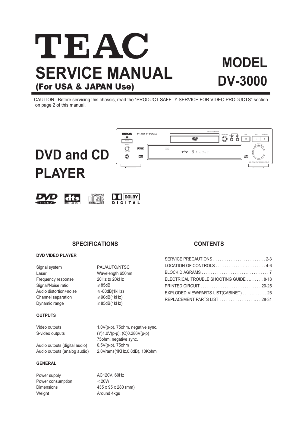 TEAC DV-3000 is a versatile DVD/VCD/CD player that offers a wide range of features for your home entertainment needs. With its support for various disc formats, including DVD, VCD, and CD, you can enjoy movies, music, and more on your home theater system. The player provides excellent audio and video quality, thanks to its 85dB signal-to-noise ratio and 20Hz to 20kHz frequency response. Additionally, it's equipped with multiple output options, including composite video, S-video, and analog audio outputs, ensuring compatibility with various TVs and audio systems.